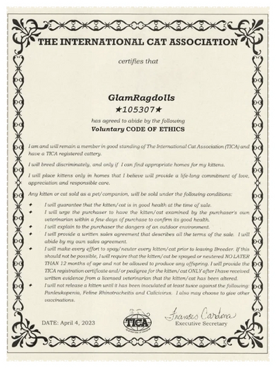 I am a member in good standing of The International Cat Association, Inc. (TICA) and have a TICA-registered cattery.
